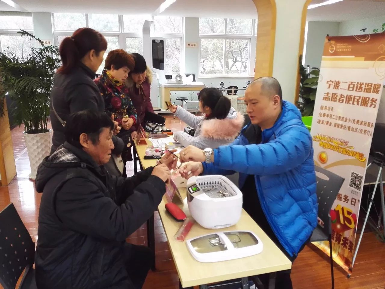 12月28日,一個(gè)陰雨綿綿的日子,冷空氣的到來(lái),使甬城染上了絲絲涼意。這樣的日子里,寧波二百志愿者團(tuán)隊(duì)一大早便驅(qū)車(chē)趕往位于鐘公廟街道的鐘盈小區(qū)進(jìn)行便民服務(wù)。盡管天氣欠佳,但志愿者的熱情確絲毫未曾懈怠,到了小區(qū)服務(wù)點(diǎn)之后??粗蝗喝呵皝?lái)的老年居民,二百志愿者們開(kāi)啟了忙碌的“行程”。此次二百提供的便民項(xiàng)目主要有:黃金眼鏡清洗、皮帶打孔、血壓測(cè)量、義務(wù)理發(fā)以及貴賓卡免費(fèi)申領(lǐng)。