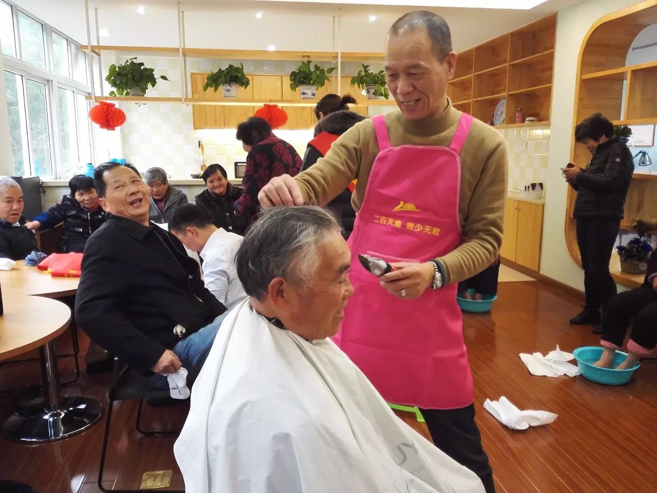 活動(dòng)開(kāi)始沒(méi)幾分鐘,義務(wù)理發(fā)區(qū)就排起了長(zhǎng)長(zhǎng)的隊(duì)伍,二百的專(zhuān)業(yè)理發(fā)人員“朱師傅”一邊仔細(xì)地為每一位老年者理發(fā),一邊同他們聊家常,爽朗的笑聲充斥著整個(gè)大廳。