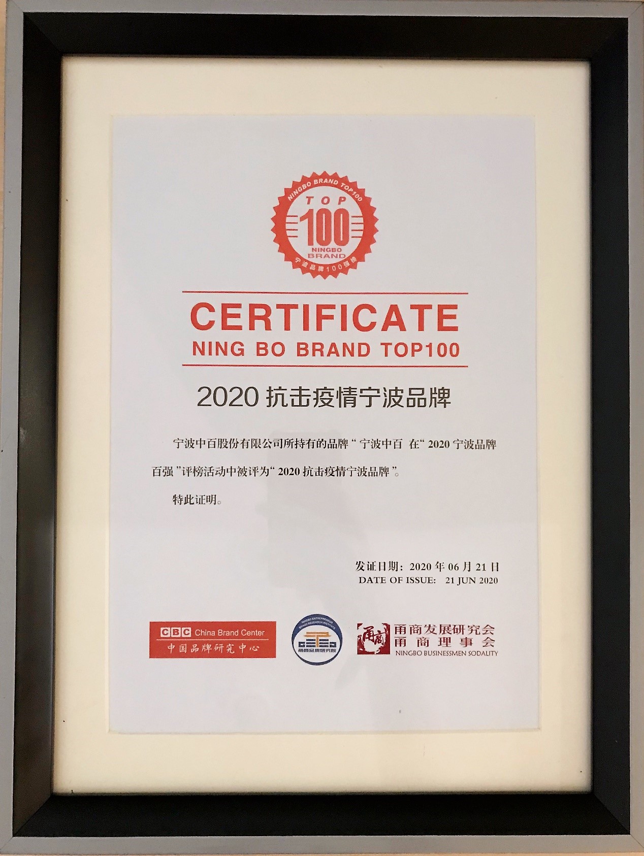 6月21日下午,在由“中國品牌研究中心”、“甬商發(fā)展研究會”、“甬商聯(lián)合會”聯(lián)合舉辦的“2020寧波品牌”授牌儀式上,我公司被授予“2020抗擊疫情寧波品牌”,寧波二百(公司全資子公司)被授予“2020寧波品牌百強(qiáng)”(二百品牌價(jià)值為34.4億元)!